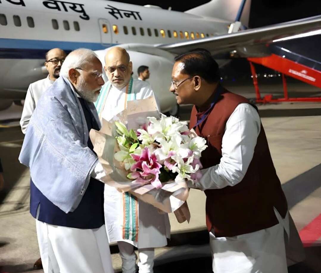 *रायपुर पहुंचे पीएम नरेंद्र मोदी, केंद्रीय गृहमंत्री अमित शाह, राज्यपाल और मुख्यमंत्री श्री विष्णुदेव साय ने किया आत्मीय स्वागत*